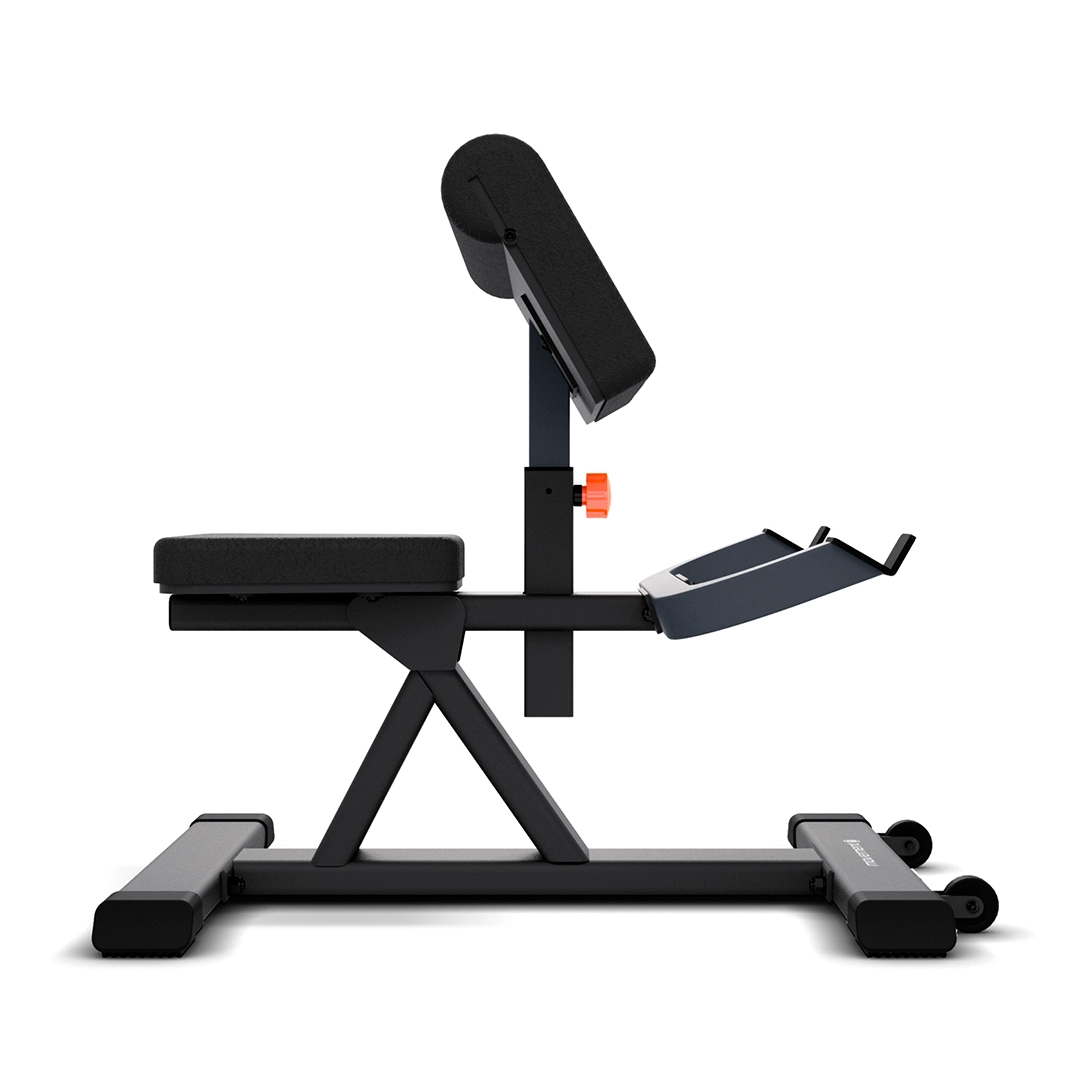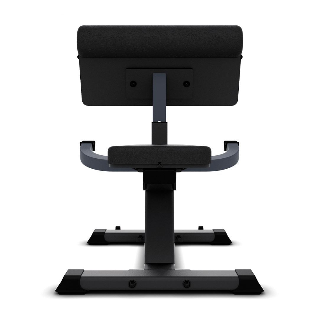 O banco é construído com uma estrutura robusta em aço com 3 mm de espessura e solda TIG/MIG, garantindo durabilidade e segurança mesmo com cargas elevadas. O estofamento é feito de poliuretano com revestimento em courvin, que proporciona o conforto necessário e a estabilidade para um treino eficaz. O apoio para os braços pode ser ajustado em oito níveis, o que permite o posicionamento perfeito para o recrutamento muscular ideal em diferentes biotipos.