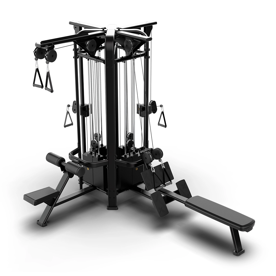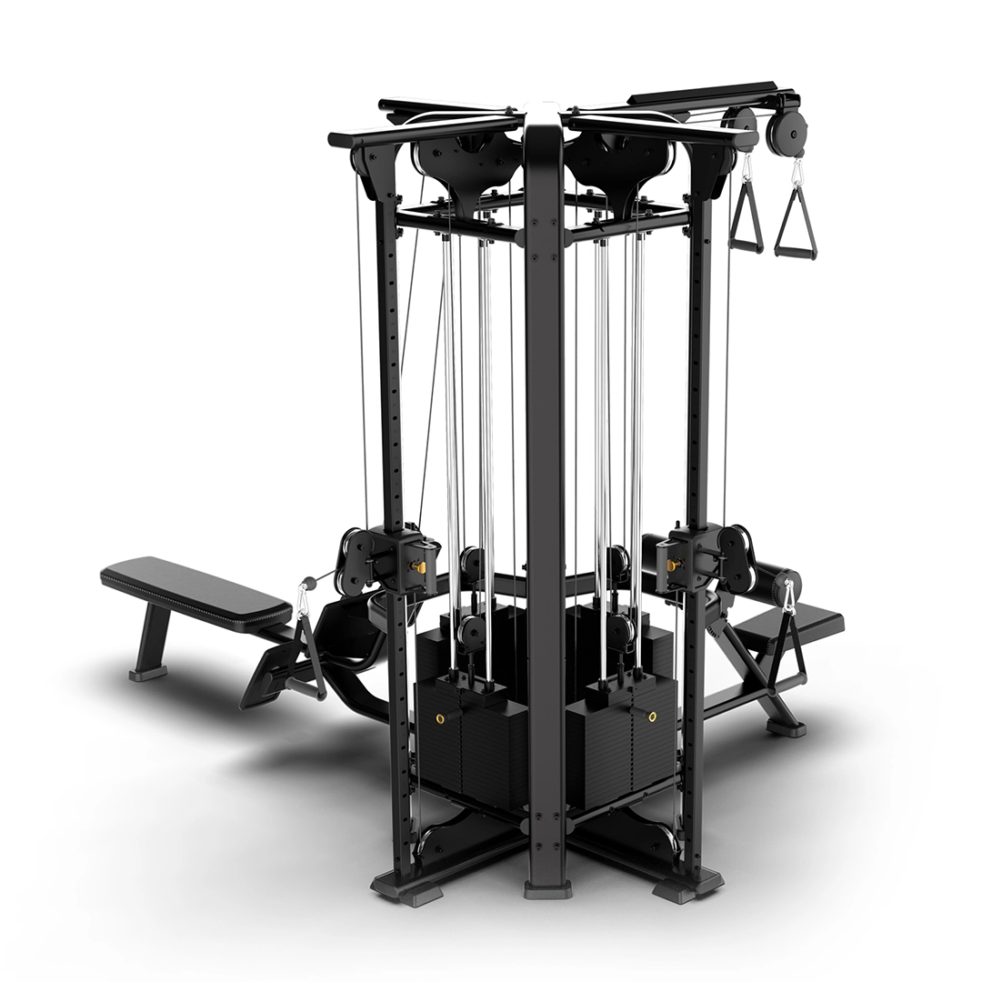 Com uma estrutura robusta em aço, solda MIG parcialmente robotizada e pintura eletrostática a pó, o equipamento é construído para suportar o uso intenso e prolongado. As torres de peso independentes garantem que cada usuário possa treinar sem interferência, com baterias de peso de 95 kg ou 120 kg e um sistema de redução de carga que proporciona mais precisão na escolha da resistência.