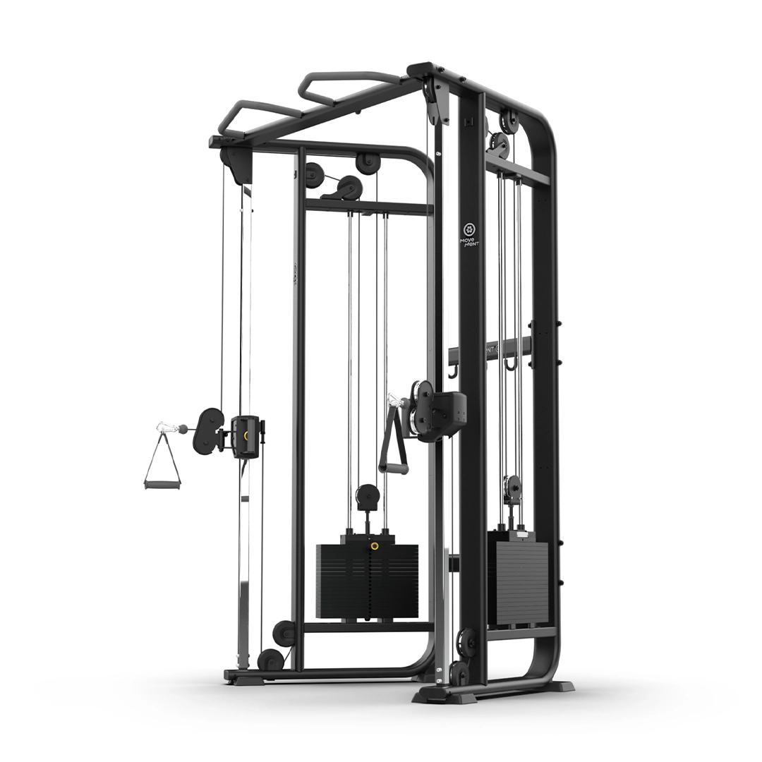 O equipamento se destaca por suas duas torres de peso de 95 kg cada e a barra fixa versátil com múltiplas empunhaduras, que permite a execução de uma ampla variedade de exercícios para peito, ombros, costas, braços, abdômen e pernas. As polias ajustáveis em 23 níveis garantem a liberdade total para variar os exercícios e adaptar a máquina ao biotipo do usuário.